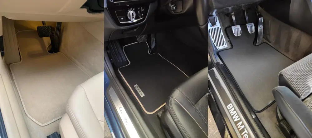 Velour BMW floor mats are custom-made for your vehicle with your choice of edging, stitching thread, and carpet color. This allows you to customize your floor mats to match your vehicle’s color details. With a velvet surface texture identical to that of OEM BMW carpet mats, velour mats provide users with a comfortable footing surface and make long journeys more comfortable. In this category, you will find velour mats compatible with all BMW series, both right-hand and left-hand drive.