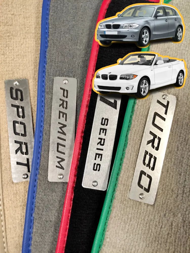 Velour BMW 1 Series floor mats for 2005-2011 1 Series 116, 118, 120i, 125i, 130i E81/E82/E87/E88 models, manufactured to the original 1 Series floor mats dimensions. The 4-piece velour mat set features non-slip pads on the bottom, ensuring they stay in place during driving. When placing your order, you can choose the mat edge, stitching, and carpet color, and decorate them with metal logos such as 1 Series, M1, or BMW. Browse our catalog now and explore all the options!