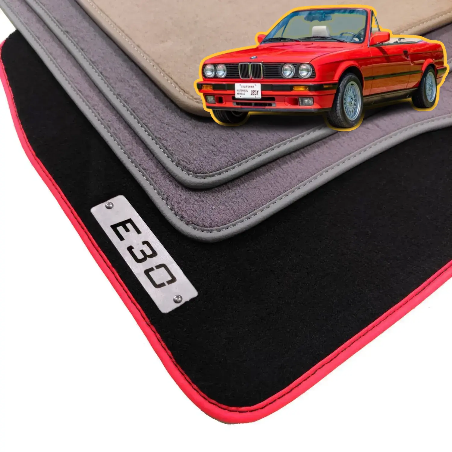 As we said, we make custom made Bmw E30 convertible floor mats. Unlike ordinary carpet mats, velour floor mats are fully configurable from top to bottom. You can select the edge color or stitching color and you can choose any carpet color from more than 30 different options. We produce your custom made mats according to your selection. In the online catalog, you will find all customizing options all together. Please check out the catalog page before make an order.