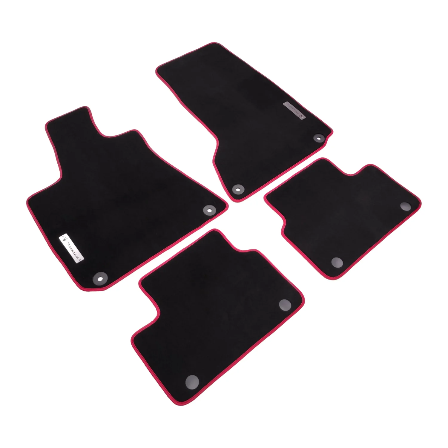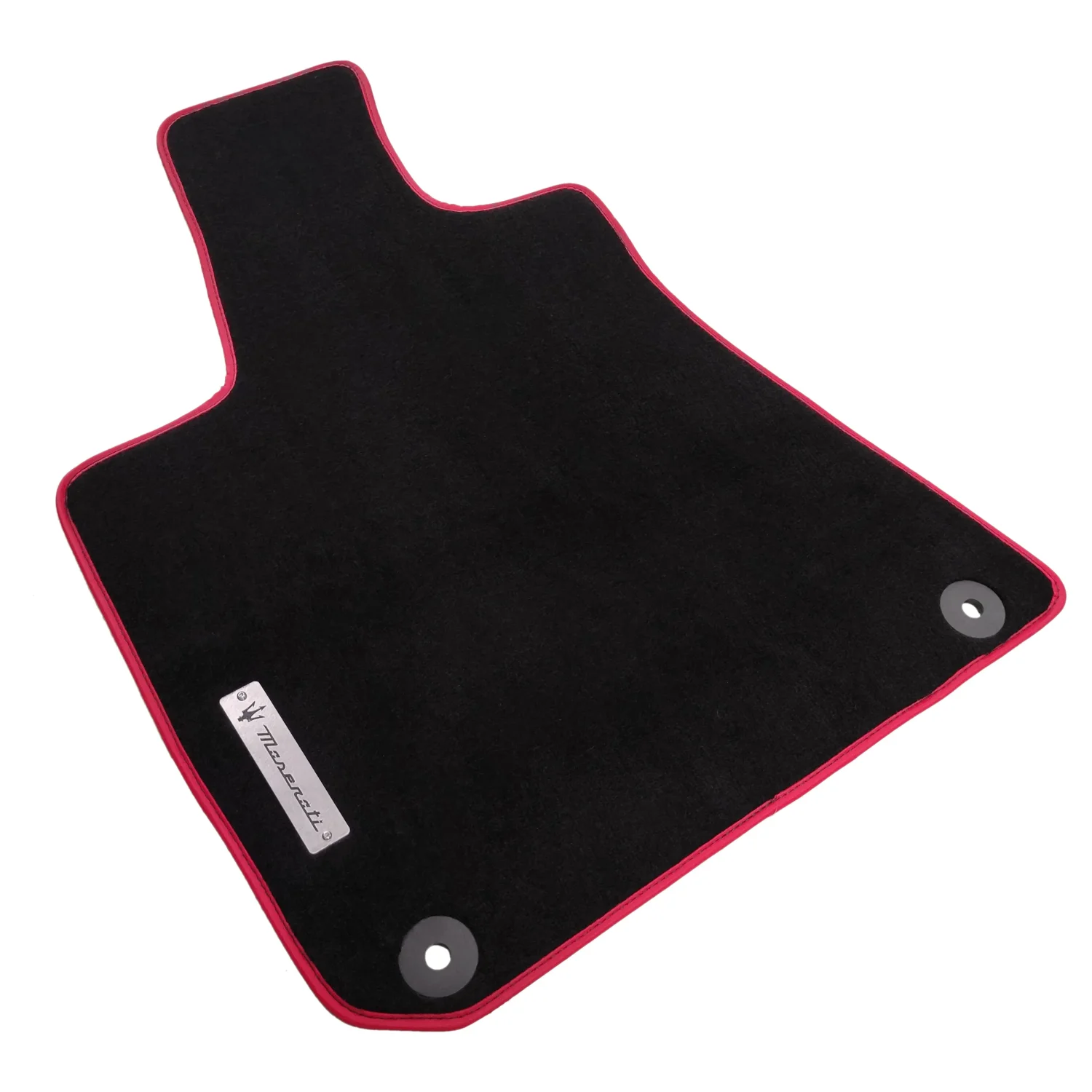 For example, the Maserati Ghibli floor mats below are made of black velour carpet and finished with red edges. This custom design visually complements the car’s red leather seats and black floor carpet. This is just one example. You can customize velour mats for your car using the options in our catalog.