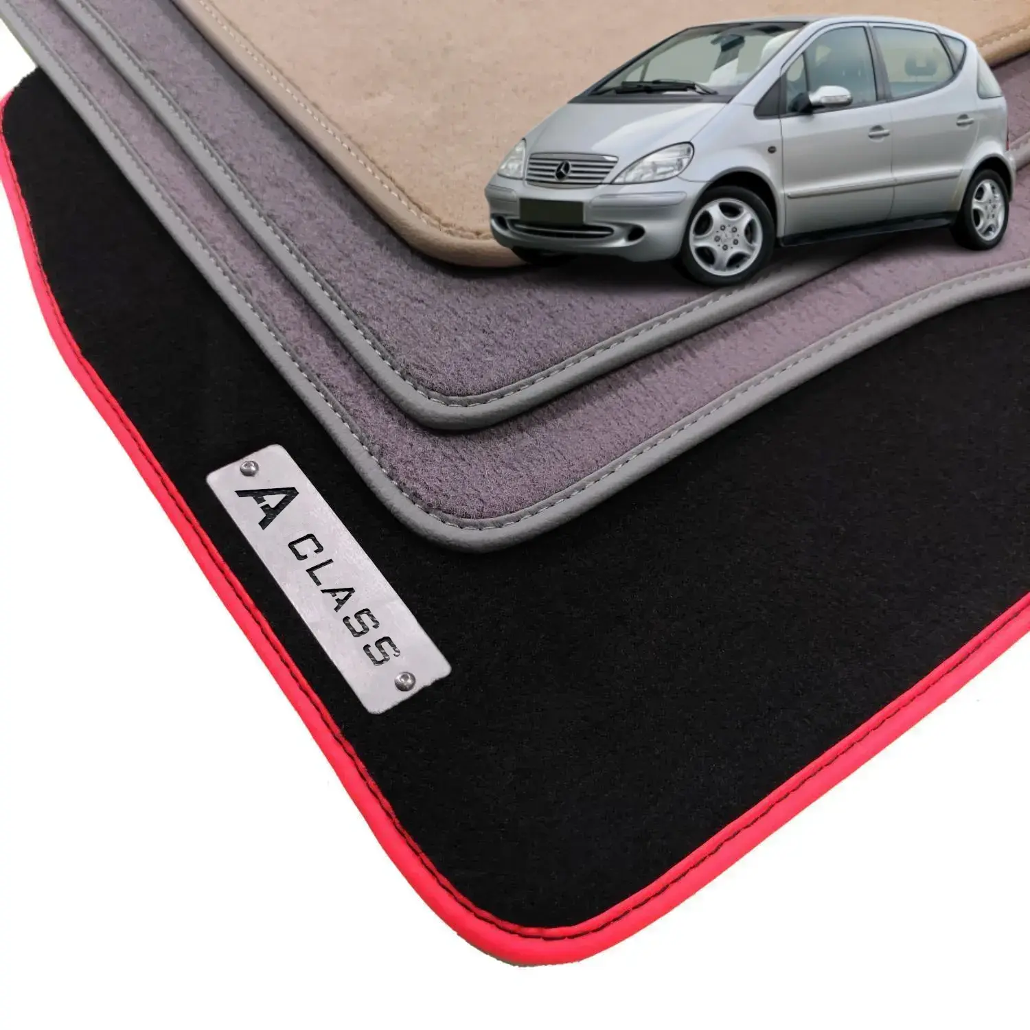 Mercedes-Benz, AMG, or A Class. These metal logos are made of stainless steel and are attached to the front mats. Measuring 11ร2.5 cm, these metal logos are special accessories for velour mats and enhance the appearance of the Mercedes W168 mat set. You can see all logo options in the collage below.