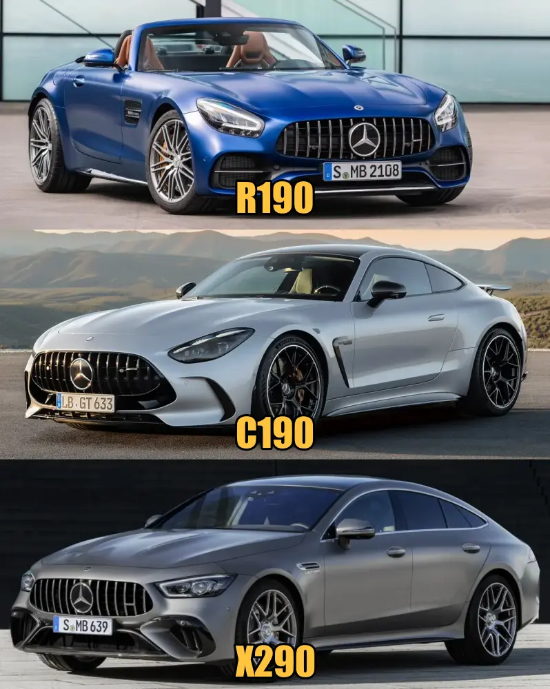 A: These are chassis codes for the AMG GT series. X290 denotes the 4-door model, R190 the roadster, and C190 the coupe model.