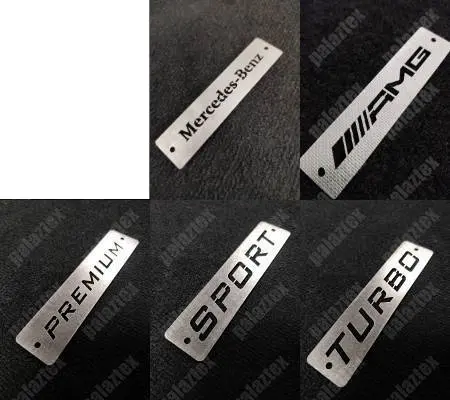 Mercedes AMG metal floor mat logos measure 11×2.5 cm and are made of stainless steel. These metal logos are a special accessory for the velour floor mat set. They are attached to the front floor mats and are not affected by moisture. You can see the metal logo options in the collage below. Metal logos are a premium alternative to ordinary embroidered logos.