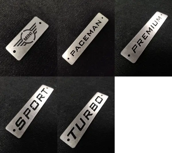 These velour floor mats, adorned with metal Paceman logos, will add a touch of elegance to your vehicle. With their ideal dimensions of 11 x 2.5 cm (the Mini logo measures 6.5 x 2.5 cm), they offer an elegant look. Since they are made of stainless steel, they are unaffected by moisture and always maintain their shine. You can view the metal logo options in the image below.